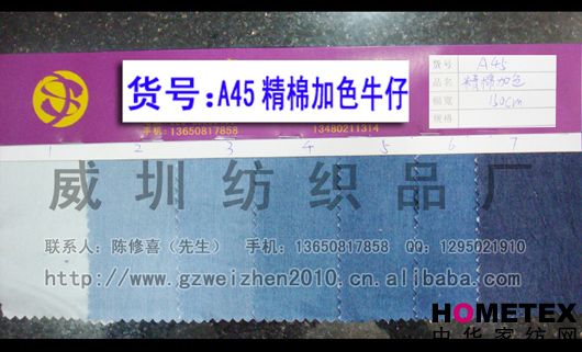 織物組織:平紋 幅寬:150cm 品名:純棉牛仔 密度:64*47 水洗工藝:砂洗 貨號:A45精棉加色 重量:* 具體用途:休閑服、工作服、褲裝、時裝 別名:A45精棉加色 印染工藝:印花 成分及含量:100%棉 主要用途:服裝用布 ======================================================================= 以上產(chǎn)品全部現(xiàn)貨供應(yīng),可隨時提供樣布卡和現(xiàn)貨,隨時發(fā)貨。所有產(chǎn)品全部是廠家直銷價,我們承諾:以超低利潤營銷,我 們只求銷售量。為保證您的利益,我司建議您在采購前先確認我們的品質(zhì)樣與顏色樣后再拿大貨,期待與您的真誠合作。因產(chǎn) 品種類較多,具體參考未盡詳盡,如有需要,請您與我們聯(lián)系。 瑞豐紡織(中大旗艦店)坐落于國內(nèi)最大的紡織面料產(chǎn)業(yè)中心—廣州中大,是一家專業(yè)銷售面料的廠家直銷商。主要經(jīng) 營產(chǎn)品有:全棉凈色、仿記憶絲面料、全棉(TC)色織等,面料品種花達上千余種,所有產(chǎn)品全部現(xiàn)貨經(jīng)營。 我們面料的品質(zhì)來源于:1、采用國內(nèi)外優(yōu)質(zhì)的原材料;2、使用精良的生產(chǎn)工藝和設(shè)備;3、完善的生產(chǎn)質(zhì)量管理體系。我 們具有開發(fā)和創(chuàng)新品種的強烈意識和優(yōu)越條件,并根據(jù)客戶需求與市場變化時時推出潮流面料。憑著多年的專業(yè)行業(yè)經(jīng)驗,根 據(jù)客戶需求,不論客戶在全國任何地方,只要提供小樣,就可在一兩天時間內(nèi)輕松獲得所需面料的信息。 批發(fā)說明供應(yīng)商支持混批 。 ============================================================= 有意請加QQ:1295021910或電話聯(lián)系。 公司名稱:威圳紡織品廠 聯(lián)系人:陳修喜先生 手機:13650817858 網(wǎng)址:http://www.gzweizhen2010.cn.alibaba.com =============================================================