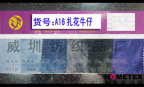 織物組織:平紋 幅寬:150cm 品名:滌棉牛仔 密度:64*47 水洗工藝:砂洗 貨號:A16扎花 重量:* 具體用途:休閑服、工作服、褲裝、時(shí)裝 別名:A16扎花 印染工藝:印花 成分及含量:75%棉,25%滌 主要用途:服裝用布 ======================================================================= 以上產(chǎn)品全部現(xiàn)貨供應(yīng),可隨時(shí)提供樣布卡和現(xiàn)貨,隨時(shí)發(fā)貨。所有產(chǎn)品全部是廠家直銷價(jià),我們承諾:以超低利潤營銷,我 們只求銷售量。為保證您的利益,我司建議您在采購前先確認(rèn)我們的品質(zhì)樣與顏色樣后再拿大貨,期待與您的真誠合作。因產(chǎn) 品種類較多,具體參考未盡詳盡,如有需要,請您與我們聯(lián)系。 瑞豐紡織(中大旗艦店)坐落于國內(nèi)最大的紡織面料產(chǎn)業(yè)中心—廣州中大,是一家專業(yè)銷售面料的廠家直銷商。主要經(jīng) 營產(chǎn)品有:全棉凈色、仿記憶絲面料、全棉(TC)色織等,面料品種花達(dá)上千余種,所有產(chǎn)品全部現(xiàn)貨經(jīng)營。 我們面料的品質(zhì)來源于:1、采用國內(nèi)外優(yōu)質(zhì)的原材料;2、使用精良的生產(chǎn)工藝和設(shè)備;3、完善的生產(chǎn)質(zhì)量管理體系。我 們具有開發(fā)和創(chuàng)新品種的強(qiáng)烈意識和優(yōu)越條件,并根據(jù)客戶需求與市場變化時(shí)時(shí)推出潮流面料。憑著多年的專業(yè)行業(yè)經(jīng)驗(yàn),根 據(jù)客戶需求,不論客戶在全國任何地方,只要提供小樣,就可在一兩天時(shí)間內(nèi)輕松獲得所需面料的信息。 批發(fā)說明供應(yīng)商支持混批 。 ============================================================= 有意請加QQ:1295021910或電話聯(lián)系。 公司名稱:威圳紡織品廠 聯(lián)系人:陳修喜先生 手機(jī):13650817858 網(wǎng)址:http://www.gzweizhen2010.cn.alibaba.com =============================================================