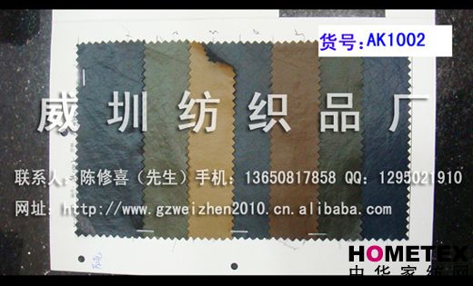 幅寬:140 別名:AK1002 厚度:0.8 主要用途:鞋、箱包、服裝、手套、家居、家具 品種:PU革 貨號(hào):AK1002 ============================================================= 以上產(chǎn)品全部現(xiàn)貨供應(yīng),可隨時(shí)提供樣布卡和現(xiàn)貨,隨時(shí)發(fā)貨。所有產(chǎn)品全部是廠家直銷價(jià),我們承諾:以超低利潤營銷,我們只求銷售量。為保證您的利益,我司建議您在采購前先確認(rèn)我們的品質(zhì)樣與顏色樣后再拿大貨,期待與您的真誠合作。因產(chǎn)品種類較多,具體參考未盡詳盡,如有需要,請您與我們聯(lián)系。 瑞豐紡織(中大旗艦店)坐落于國內(nèi)最大的紡織面料產(chǎn)業(yè)中心—廣州中大,是一家專業(yè)銷售面料的廠家直銷商。主要經(jīng)營產(chǎn)品有:全棉凈色、仿記憶絲面料、全棉(TC)色織等,面料品種花達(dá)上千余種,所有產(chǎn)品全部現(xiàn)貨經(jīng)營。 我們面料的品質(zhì)來源于:1、采用國內(nèi)外優(yōu)質(zhì)的原材料;2、使用精良的生產(chǎn)工藝和設(shè)備;3、完善的生產(chǎn)質(zhì)量管理體系。我們具有開發(fā)和創(chuàng)新品種的強(qiáng)烈意識(shí)和優(yōu)越條件,并根據(jù)客戶需求與市場變化時(shí)時(shí)推出潮流面料。憑著多年的專業(yè)行業(yè)經(jīng)驗(yàn),根據(jù)客戶需求,不論客戶在全國任何地方,只要提供小樣,就可在一兩天時(shí)間內(nèi)輕松獲得所需面料的信息。 批發(fā)說明供應(yīng)商支持混批 。 ============================================================= 有意請加QQ:1295021910或電話聯(lián)系。 公司名稱:威圳紡織品廠 聯(lián)系人:陳修喜先生 手機(jī):13650817858 網(wǎng)址:http://www.gzweizhen2010.cn.alibaba.com =============================================================