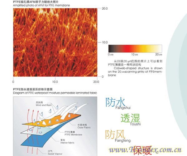 特點(diǎn):防水、防毒、防腐、透氣、透濕、保暖、耐寒、耐老化、耐水洗、回彈性好、不起泡、環(huán)保,被稱為會(huì)呼吸的面料。