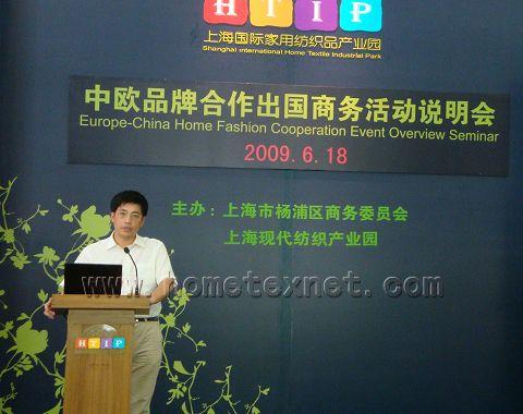 6月18日,“2009中歐品牌合作商務(wù)活動”在家紡園隆重召開。來自向比利時、荷蘭、法國、意大利、德國和西班牙各使館、商會以及50余家企業(yè)家代表匯集參加了說明會。作為主辦單位的上海市楊浦區(qū)商務(wù)委員會經(jīng)琪主任,上,F(xiàn)代紡織產(chǎn)業(yè)園總經(jīng)理周根生親自對此次活動的開幕致辭!