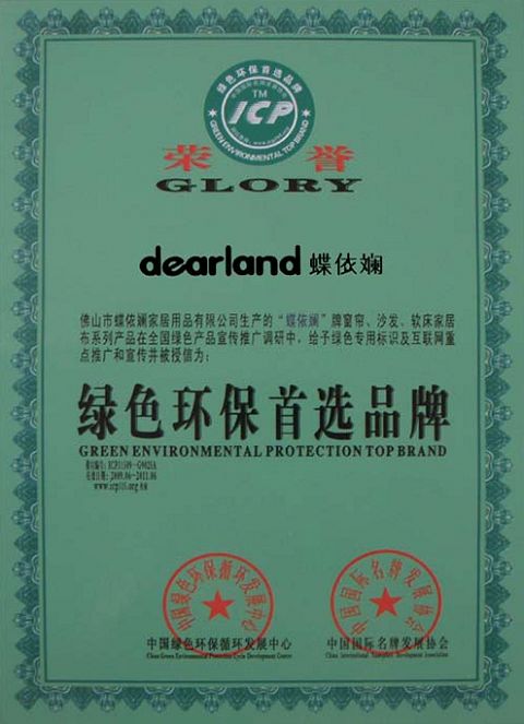 “蝶依斕”牌窗簾、沙發(fā)、軟床、家居布藝系列產(chǎn)品,經(jīng)中國國際名牌發(fā)展協(xié)會、中國綠色環(huán)保循環(huán)發(fā)展中心進行的全國市場調(diào)查評定,認定質(zhì)量穩(wěn)定、信譽保證、居家環(huán)保,被授予“綠色環(huán)保首選品牌”榮譽稱號。
