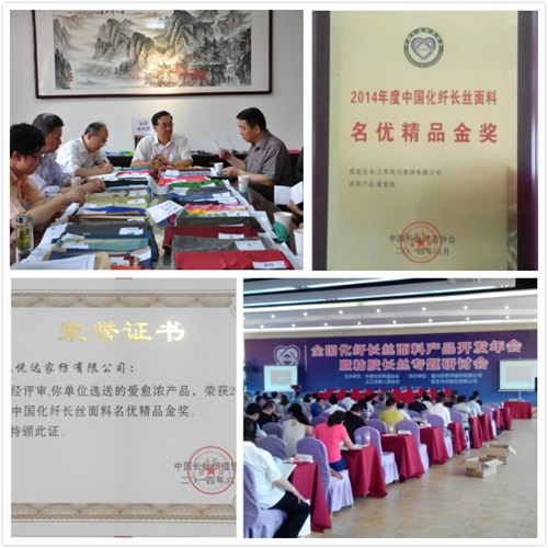2014-6-23近日,在全國化纖長絲面料產(chǎn)品開發(fā)年會上,悅達(dá)家紡選送的“愛愈濃”新產(chǎn)品,榮獲2014年度中國化纖長絲面料名優(yōu)精品金獎(jiǎng)。此次會議共授予仿真類、運(yùn)動(dòng)休閑類、新型功能類、家紡類、防寒服類等7個(gè)類別名優(yōu)精品金獎(jiǎng)67個(gè)、名優(yōu)精品獎(jiǎng)108個(gè)、入圍獎(jiǎng)42個(gè)。悅達(dá)家紡新產(chǎn)品位列全國7個(gè)家紡類名優(yōu)精品金獎(jiǎng)產(chǎn)品第三位,...[繼續(xù)閱讀] -